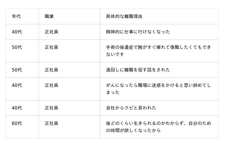 ・離職理由は「治療との両立が難しかったから」が7割を占める。本人の意思とは異なり、退職を促されたケースも