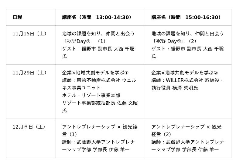 初年度となる2025年度は、観光に関する事例を学びつつ、自身のうちに秘めたアントレプレナーシップを呼び起こすプログラムを実施するほか、静岡県裾野市の協力のもと、同市に対して観光に関する提案を行います。講義は2025年11月15日(土)、11月29日(土)、12月6日(土) の午後に都内で実施し、2026年2月14日(土) 、15日(日)には静岡県裾野市にてフィールドワークを行います。