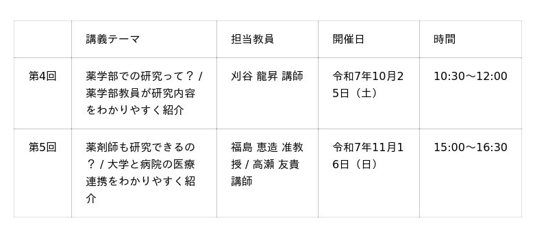 薬学部の教員が、薬の作用機序や開発の流れ、最新の研究内容、薬剤師の研究活動などを分かりやすく解説します。