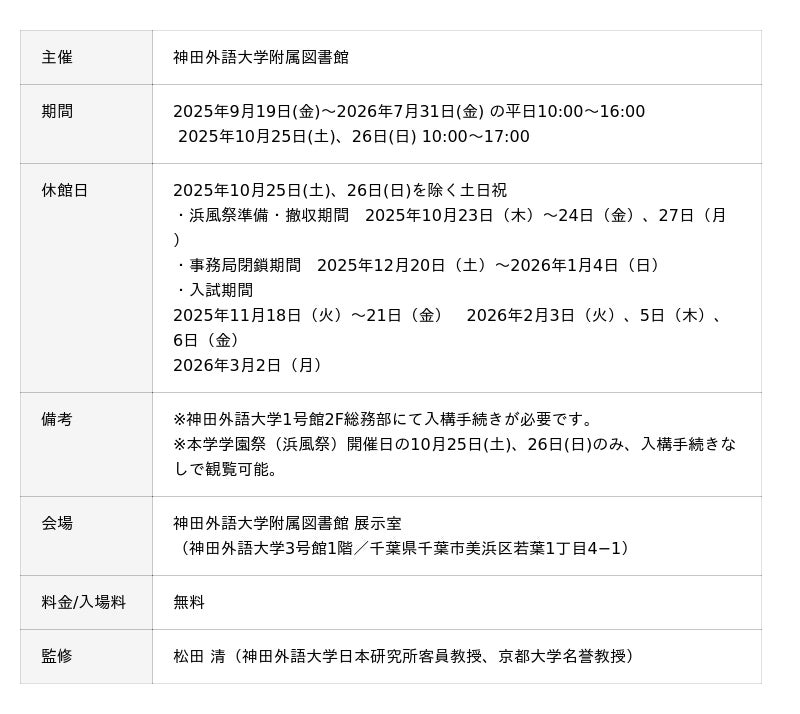 本学附属図書館神田佐野文庫は江戸時代後期から明治維新を経て、連合国軍占領期まで(1780年代から1950年代)の約170年間に、日本で刊行あるいは書写された西欧語・西欧文化の教育研究資料、および同時期に西欧世界で出版された日本関係洋書を幅広く収集した特色ある神田外語大学の文化交流史資料コレクションです。※ポスター別添