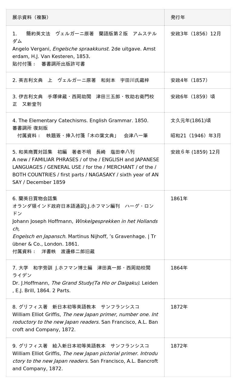 本展示では、神田佐野文庫から以下の9点を複製し、蘭学から英学への転換期の洋学の姿を紹介します。