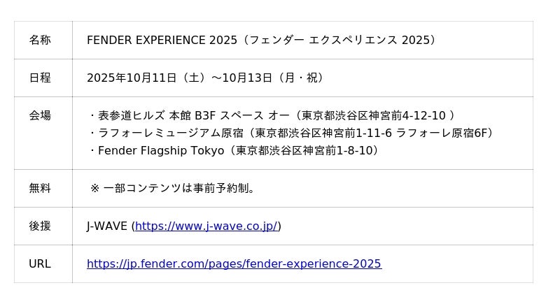 音楽・クリエイティビティ・そして人とのつながりを祝う体験型イベント【FENDER(R) EXPERIENCE 2025】が、2025年10月11日(土)~13日(月・祝)の3日間、原宿・表参道エリアで開催されます。フェンダーが独自に企画・キュレーションを手掛ける本イベントは、単なる展示会やライブイベントにとどまらず、音楽、そしてギター/ベースを愛するアーティスト、ファン、そしてこれからのプレイヤーたちが一堂に会し、情熱を分かち合う特別な場であり、フェンダーだからこそ実現できる、世界中の音楽コミュニティをリアルに結びつけられるイベントとなります。この祭典は、原宿・表参道エリアの3つの象徴的な会場で、迫力のライブパフォーマンス、インタラクティブなワークショップ、そして世界屈指のギターやベースに触れる特別な体験を提供します。過去に開催された、最高峰の楽器を生み出すFender Custom Shopの祭典 『Fender(R)️ Custom Shop Experience』のイベントの興奮を土台に、【FENDER(R) EXPERIENCE 2025】はそのスケールと内容を大きく拡張。今回は、フェンダーブランド全体の世界観を思う存分体感できる3日間として、ファッションと創造性が交差する原宿・表参道を舞台に、新たな音楽のムーブメントを創出します。
