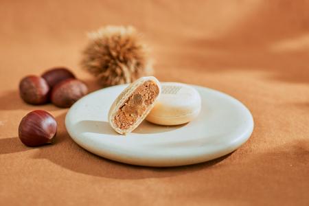 食感の良い皮の中に、コロンビア産の2種のチョコレートをブレンドしたエアリーなクリームと小布施の和栗を挟みました。栗本来の旨みを引き出すため、甘みと食感にこだわり作り上げた栗の甘露煮を、なめらかな栗あんで包み中に忍ばせています。