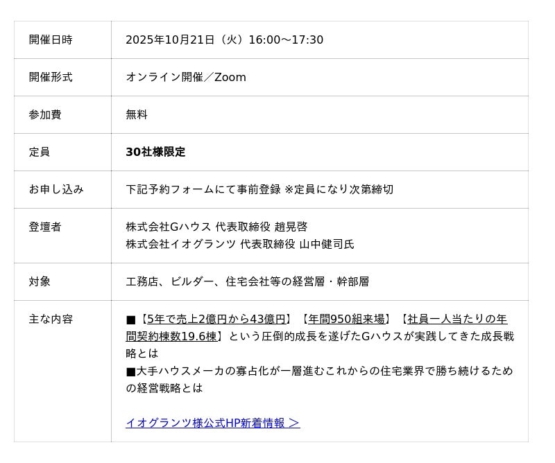 【30社様限定・無料ウェビナー】売上2億から43億への圧倒的成長を実現!Gハウス代表が明かす「工務店勝ち残り経営戦略セミナー」を10月21日(火)開催