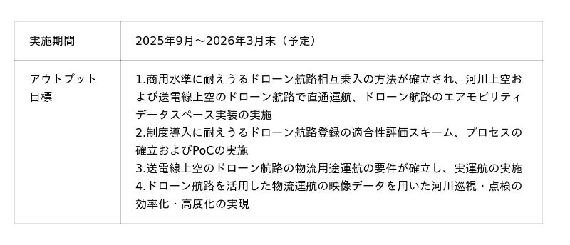 具体的には、2024年度には、先行地域である浜松市天竜川上空に約180kmと秩父エリアの送電設備上空に、約150kmのドローン航路が整備されました。今後の全国および世界への展開を目指し、今回、本事業で「複数事業者の相互乗り入れ等の実現を目指したドローン航路システムの改修・高度化」、「エアモビリティデータスペース群の確立(ウラノス・エコシステム*2連携)」、「仕様・規格への適合性認証制度等運用および、国際標準化/海外展開に向けた戦略検討」、「航路の相互乗り入れ実証や国際標準化活動」など、多岐にわたる取り組みを実施します。
