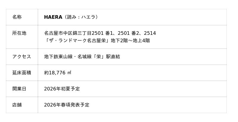 J.フロント リテイリング株式会社、株式会社大丸松坂屋百貨店、株式会社パルコ、 J.フロント都市開発株式会社は、2026年初夏、名古屋市中区錦三丁目において開発中の「ザ・ランドマーク名古屋栄」の地下2階~地上4階にて、新たな商業施設「HAERA(ハエラ)」を開業いたします。