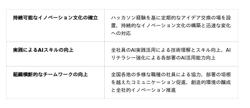 本取り組みは、「AIが時間をつくり、人が価値をつくる」というビジョンのもと、社員自らがAIを活用した新たな業務改善・サービス創出のアイデアを実践する場として実施するものです。