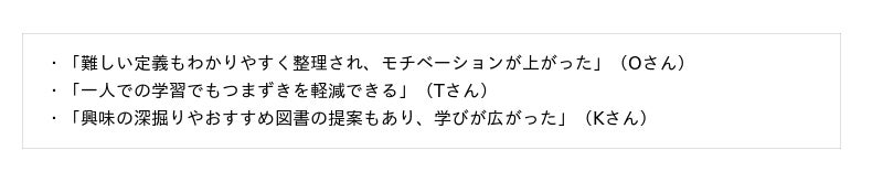 通信教育部修了生3名(Oさん、Tさん、Kさん)が試用し、以下のような評価が得られました。