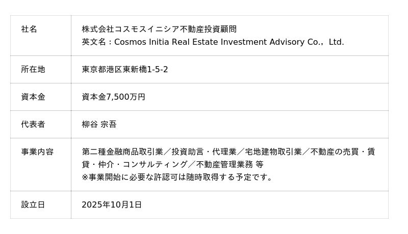 アセットマネジメント事業を担う新子会社「株式会社コスモスイニシア不動産投資顧問」を設立(ニュースリリース)