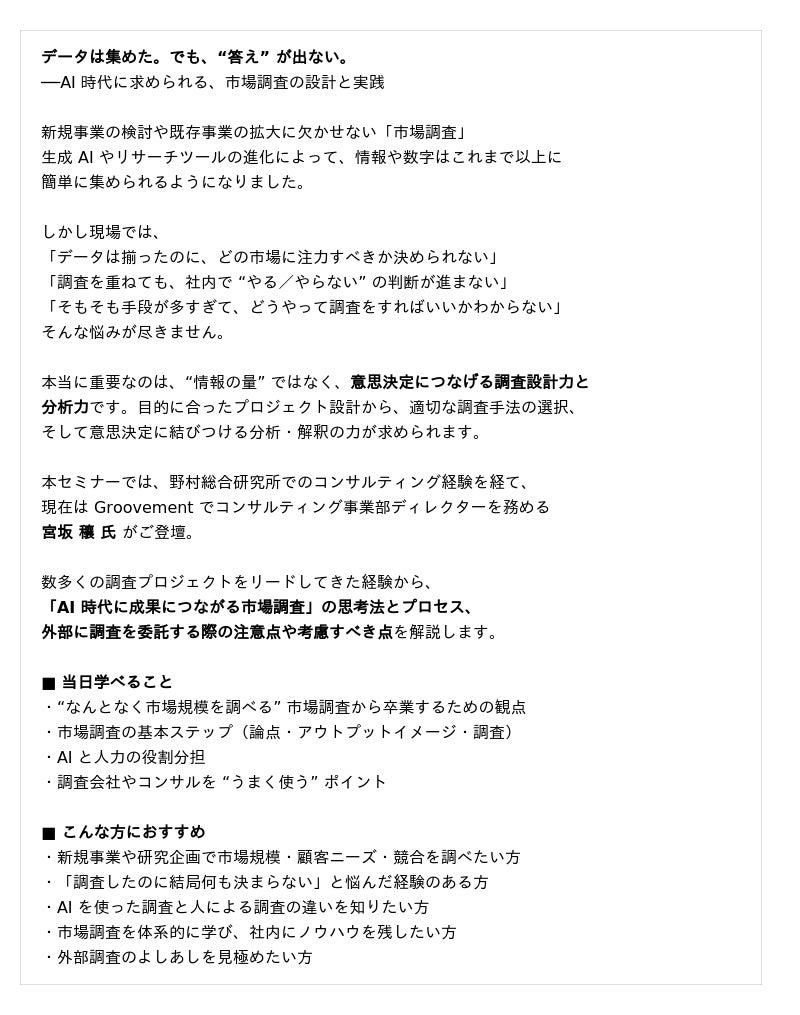 「知見と、挑戦をつなぐ」をミッションにグローバルなナレッジプラットフォームを運営する株式会社ビザスク(以下、当社)は、『AI 時代の市場調査』をテーマに、株式会社Groovement コンサルティング事業部 ディレクター/Pro Essence プロダクトマネージャー 宮坂 穰氏 ご登壇による無料オンラインセミナーを 10/22 (水) 14:00 より開催します。