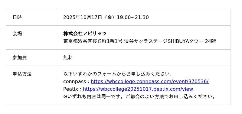 株式会社アピリッツ(本社:東京都渋谷区、代表取締役:和田順児)は、ワーキンググループ「WBCカレッジ」の活動をスタートいたしました。渋谷サクラステージで体感型勉強会を定期開催いたします。