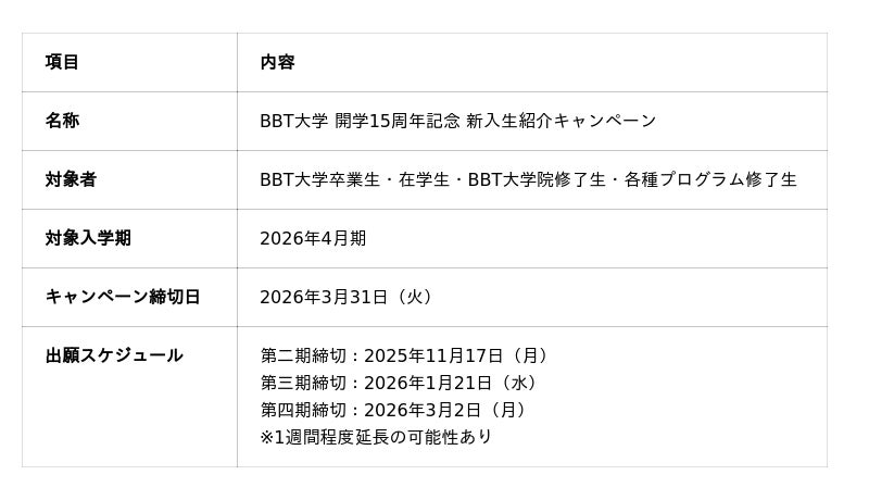 ■ BBT大学 開学15周年特別企画「新入生紹介キャンペーン」概要