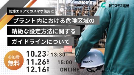 「世界中のガス事故をなくす」を大目標に掲げる新コスモス電機株式会社(本社:大阪市淀川区、代表取締役社長:高橋良典)は、2025年10月23日、11月26日、12月16日に、「プラント内における危険区域の精緻な設定方法に関するガイドラインについて」のオンラインセミナーを開催します。