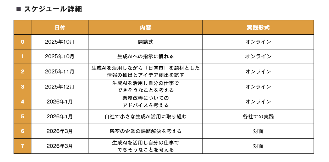 2025年10月16日(木)より、日置市・地域企業・スクーの三者が連携して実施する人材育成プログラムです。約6ヶ月間にわたる本プログラムでは、オンライン学習サービス「Schoo」を使用した学びと、対面研修を組み合わせ地域で働く人々に体系的な学習機会を提供します。