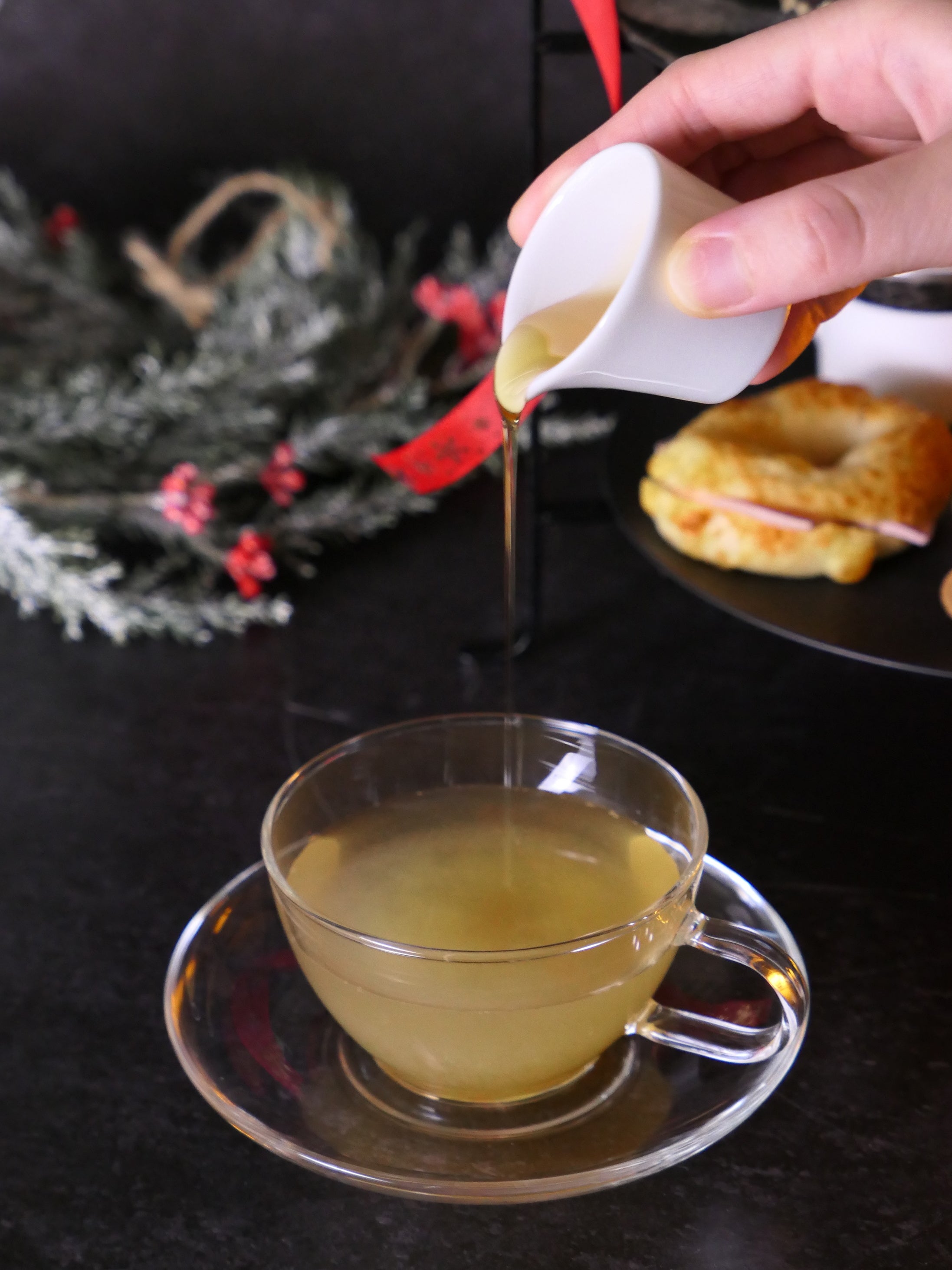 ジンジャーと林檎が香る、聖夜のマーケットを思わせるホットドリンク。やさしい甘みとスパイスの香りが広がる、クリスマス限定の一杯。お好みで添えた熱海のからす山椒の生蜂蜜が、爽やかな余韻を添えます。