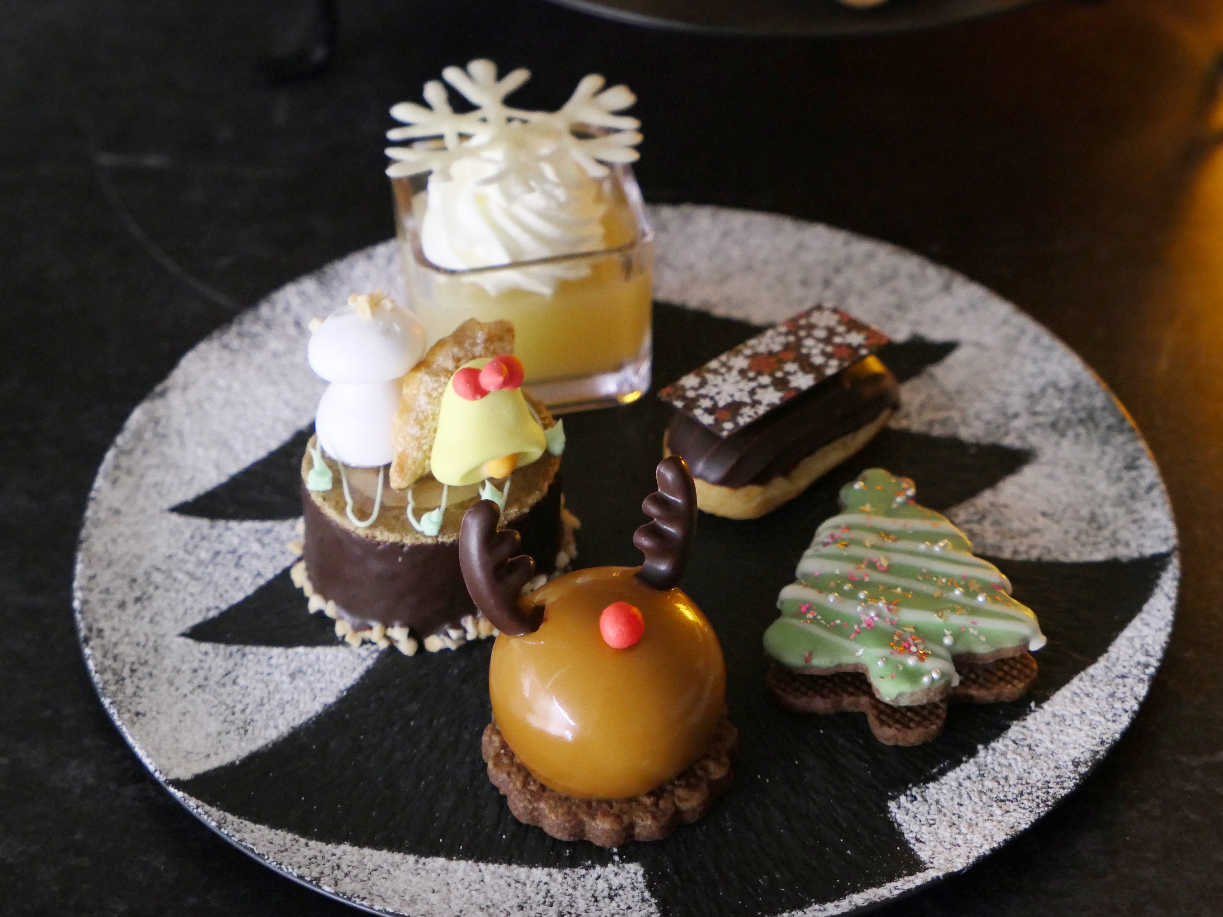 ショートケーキやベリータルト、シュトレンをはじめエクレア、トナカイムース、ミニブッシュ・ド・ノエルなど、見た目にも華やかなスイーツがテーブルを彩ります。