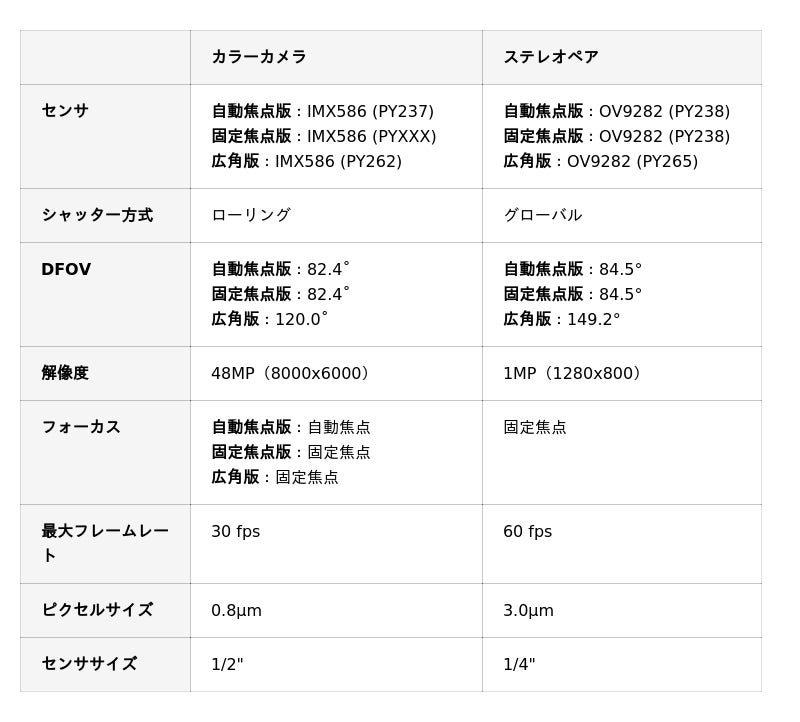 - RVC4(Robotics Vision Core 4)- - 8コアARM CPU(Qualcomm Snapdragon 8シリーズ)、8 GB RAM、128 GBストレージ- - Linux Kernel 5.15ベースのLuxonis OSを採用- - コンピュータビジョン:ImageManipノードによる機能(ワープ、リサイズ、クロップ)、エッジ検出、特徴追跡、カスタムCV関数- - AIパフォーマンス:48 TOPS(INT8)& 12 TOPS(FP16)- - ステレオ深度認識機能:フィルタリングや後処理、RGB‑深度整合に優れ、高度に設定可能- - ObjectTrackerノードによる 2D / 3D オブジェクトの追跡対応- ステレオ深度認識機能- - ステレオカメラ間のベースライン:75 mm- - 最適計測深度範囲:70 cm ~ 12 m- - 深度認識精度(絶対深度誤差):- - - ~4 m:<2%- - - 4~7 m:<4%- - - 7~10 m:<6%- IR認識機能- - レーザークラス:クラス1 [EN/IEC 60825-1, Edition 3 (2014)]- - アクティブステレオ機能:HiMax技術により、特徴の乏しい表面での深度認識精度を向上- - 暗視:低照度・無照度環境での認識が可能- 消費電力:最大25 W- - 筐体:- - - 工業グレードのアルミ筐体と、レンズ保護用のGorilla Glassパネルを採用- - - IP67 防塵防水性能- - 取付:- - - 1/4インチ三脚ネジ- - - 背面 & 底面 75 mm M4 VESA マウントに対応- 寸法:143.5 x 42.5 x 67.3 mm- 重量:674 g- カメラ