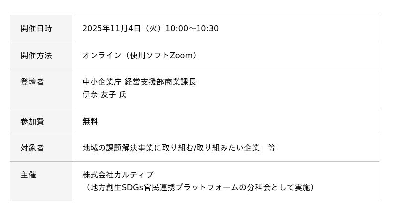 企業版ふるさと納税を活用した地域課題解決プラットフォーム「river(リバー)」を運営する株式会社カルティブ(本社:神奈川県横浜市、代表取締役:池田 清)は各省庁の出している補助金・交付金の活用方法を自治体様向けに伝える「地方創生制度活用シリーズセミナー」として、2025年11月4日(火)に中小企業庁担当者による自治体限定オンラインセミナー「ローカル・ゼブラ政策について」を開催します。