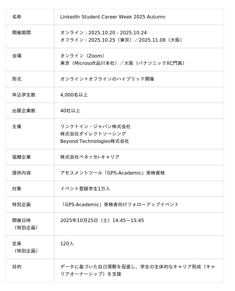 グローバルキャリアフェス「LinkedIn Student Career Week 2025 Autumn」開催、ベネッセ i-キャリア協賛で登録学生1万人に「GPS-Academic」受検機会を提供