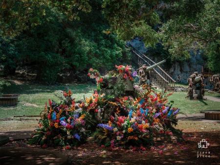 青い海と空が広がる南国の鮮やかな景色の中で、時が止まったように放置され朽ちた戦車や大砲が存在感を放っていた。その光景が記憶に強く残っており、終戦から80年という節目の年に、ふと浮かんだのが、「もしあの戦車をフラワーアートにしたらどうなるんだろう?」という一つの想像でした。