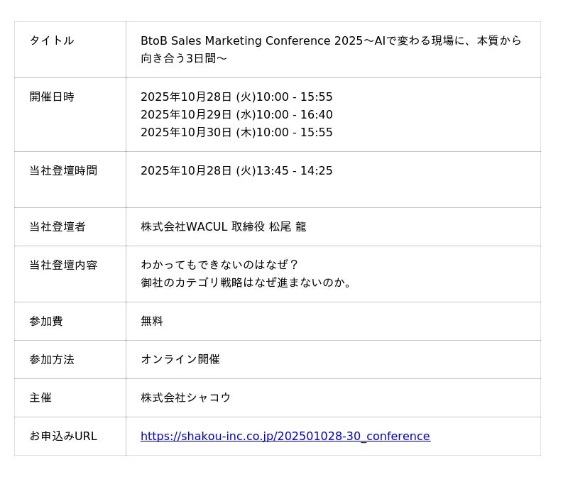 2025年10月28日~10月30日開催のカンファレンス「BtoB SalesMarketingConference 2025~AIで変わる現場に、本質から向き合う3日間~」にWACULが登壇します