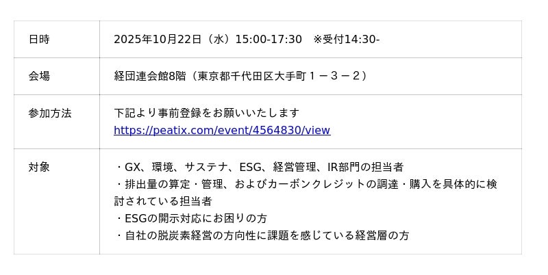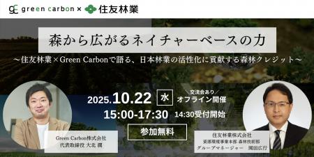 ネイチャーベースのカーボンクレジット創出・販売事業を展開するGreen Carbon株式会社(代表取締役:大北潤、以下Green Carbon(グリーンカーボン))は、住友林業株式会社(本社:東京都千代田区、代表取締役社長:光吉 敏郎、以下 「住友林業」)と共催し、「森から広がる、ネイチャーベースの力 ~住友林業×Green Carbonで語る、持続可能な未来へのクレジット戦略~セミナー(以下:本セミナー)」を2025年10月22日(水)15:00~17:30で開催する事をお知らせします。