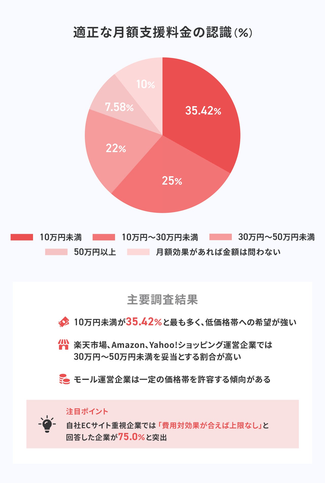 「10万円未満」が35.4%と最も多く、低価格帯への希望が強い一方で、楽天市場、Amazon、Yahoo!ショッピング運営企業では「30万円 ~ 50万円未満」を適正とする割合が高く、一定の価格帯を許容する傾向があります。