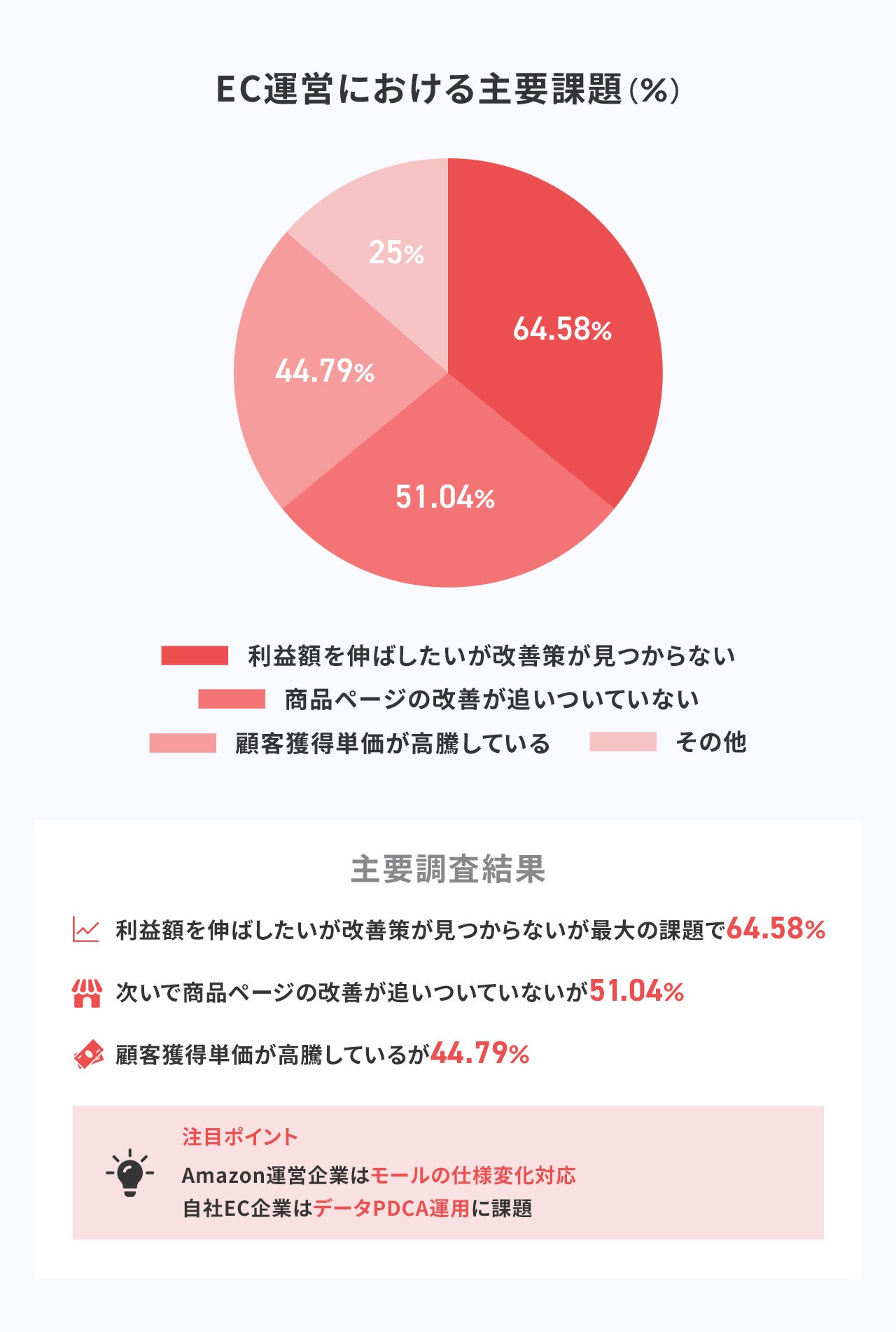 続いて「商品ページの改善が追いついていない」(51.0%)、「顧客獲得単価が高騰している」(44.8%)が挙げられています。