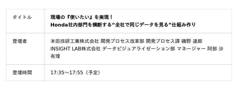 INSIGHT LAB株式会社(本社:東京都新宿区、代表取締役 社長 CEO:遠山 功、証券コード:227A、以下、当社)は、2025年10月28日(火)に神田明神ホールで開催される「The AI Reality Tour Tokyo 2025」(主催:クリックテック・ジャパン株式会社)に出展し、パートナー講演および展示ブースにて、当社が支援した本田技研工業株式会社(以下、Honda)の部門横断DX事例をご紹介いたします。