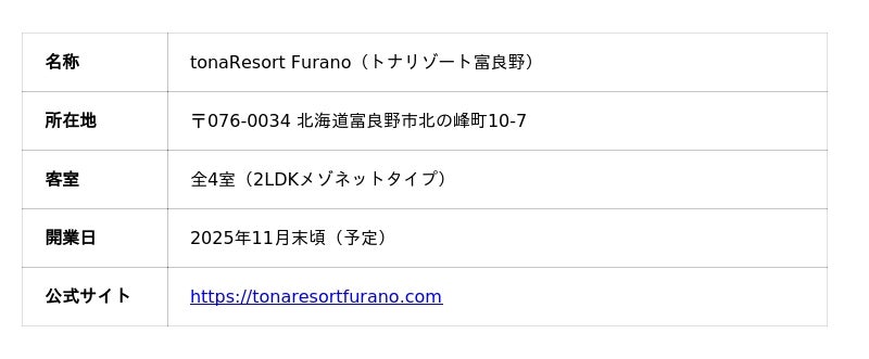 トナリゾート株式会社(本社:神奈川県川崎市 / 代表取締役:新川裕也 / 以下、トナリゾート)は、2025年11月末、北海道富良野市に「tonaResort Furano(トナリゾート富良野)」をグランドオープンいたします。本ホテルは、グループ会社である半導体メーカー「トナリズム」が培ってきた最先端のノウハウとIoT技術を活用し、大切な人と過ごす時間をより豊かにする「次世代スマートホテル」です。世界有数のパウダースノーを誇るスキーリゾート地・富良野で、快適さと機能性を兼ね備えた特別な滞在空間をご提供します。
