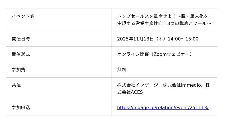 顧客対応クラウド「Re:lation(リレーション)」を提供し、6,000社以上(※)の導入実績を誇る株式会社インゲージ(本社:大阪府大阪市、代表取締役:和田 哲也)は、営業の属人化解消と生産性向上をテーマとするウェビナー「トップセールスを量産せよ!~脱・属人化を実現する営業生産性向上3つの戦略とツール~」を2025年11月13日(木)に開催します。