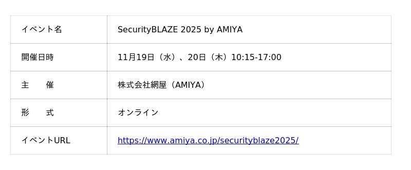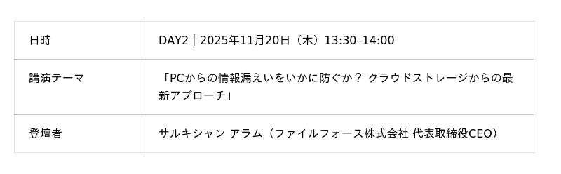 クラウドストレージ「Fileforce」を提供するファイルフォース株式会社(本社:東京千代田区 代表取締役:サルキシャン アラム)は、株式会社網屋(本社:東京都中央区 代表取締役社長 石田 晃太)主催のカンファレンス「SecurityBLAZE 2025」のDAY2|11月20日(木)13:30-14:00のスポンサー講演にて、代表取締役 アラム・サルキシャンが登壇いたします。