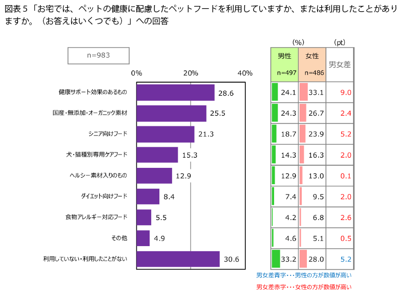 犬に限らずペットを飼っている人に、ペットの健康に配慮したペットフードを利用してるか、利用したことがあるかを聞くと(図表5)、「利用していない・使用したことがない」人が30.6%でした。