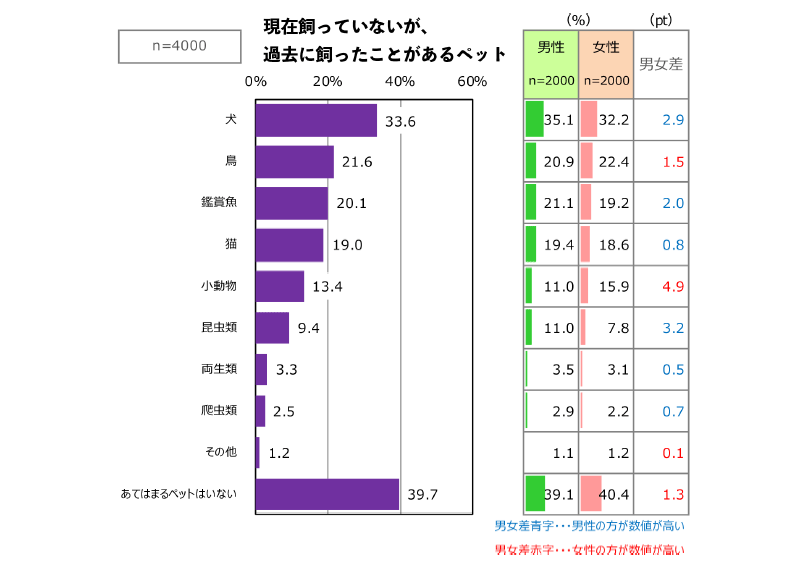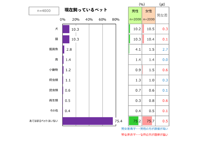 「ペット」と聞いて、最初に思い浮かべるペット、現在飼っていないが、過去に飼ったことがあるペットについては、どちらも犬のほうが猫より割合が高くなっていますが、現在飼っているペットについては、犬も猫も、どちらも10.3%と同じ割合になりました。