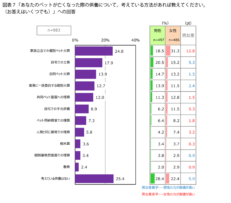 現在、ペットを飼っている人を対象に、ペットが亡くなった際の供養について考えているかを聞いたところ(図表7)、「考えている供養はない」という人は25.4%で、残りの約3/4の人たちは何らかの供養を考えています。