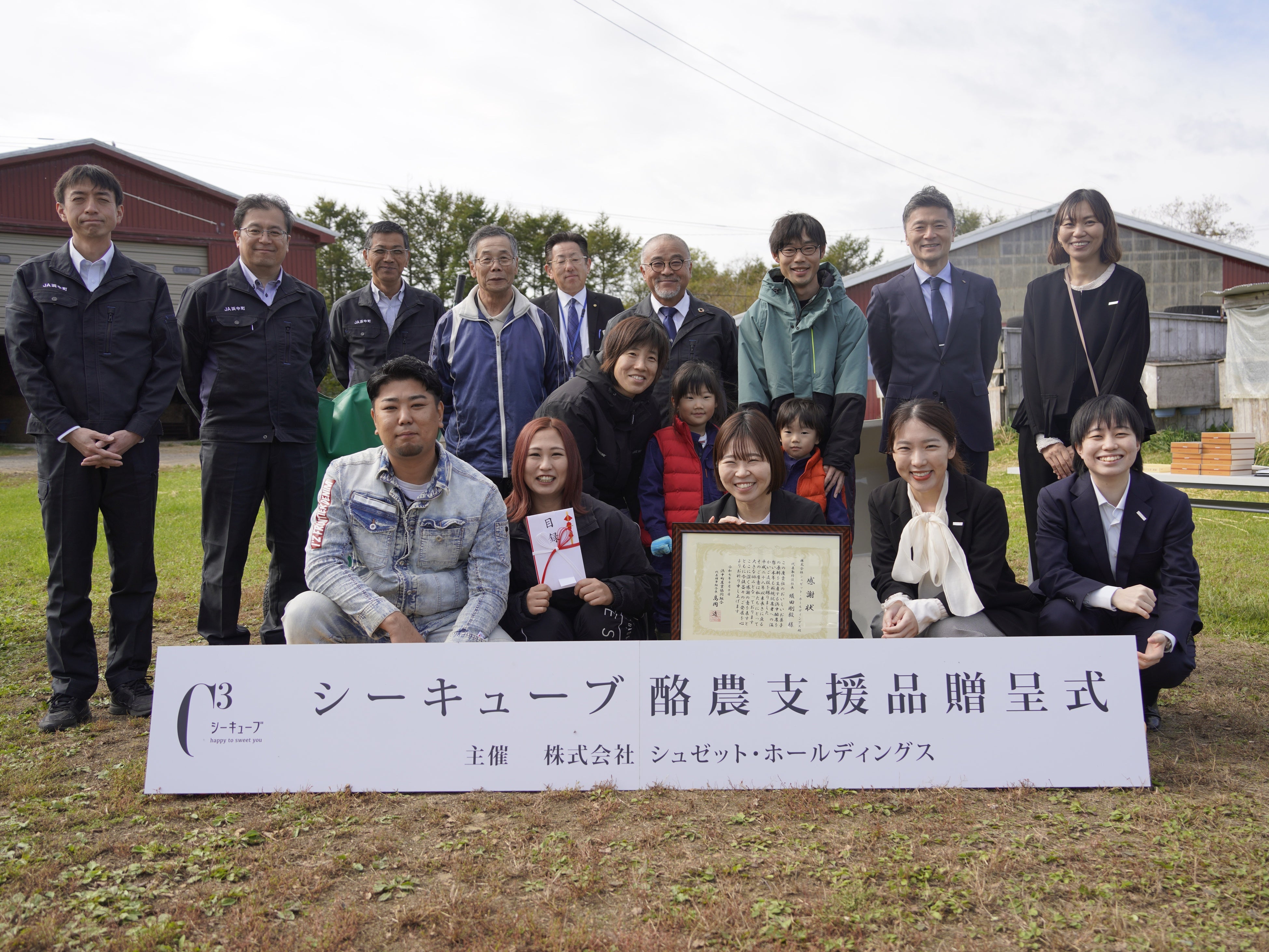株式会社シュゼット・ホールディングス(本社:兵庫県西宮市、代表取締役社長:蟻田剛毅)が展開する洋菓子ブランド「シーキューブ」は、北海道浜中町就農者研修牧場にて、離農加速問題への支援を目的とした贈呈式を2025年10月10日に開催しました。本取り組みは、新規就農者の酪農支援を目的としており、9回目となる今年は子牛運搬車や作業服など、酪農に必要な機材・道具を贈呈しました。贈呈式では、酪農家の皆様、浜中町農協の皆様、タカナシ販売の皆様とともに、シーキューブのティラミスを囲みながら団欒のひとときを過ごし、これからも力を合わせて美味しいお菓子をお客様に届けようという思いを共有し、団結を深めました。