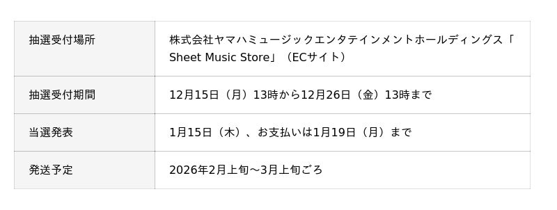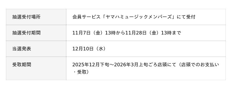 ※本抽選分はヤマハミュージック直営15店舗店頭でのお支払い・受取限定となります。