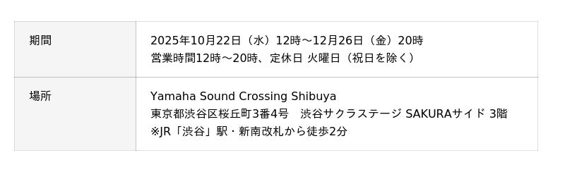 また、10月22日(水)より期間限定で、当社ブランド発信拠点「Yamaha Sound Crossing Shibuya(ヤマハサウンドクロッシング渋谷)」にて本製品を展示します。さらに、11月1日(土)・2日(日)に開催される「東京楽器博2025」のヤマハブースでも展示予定です。