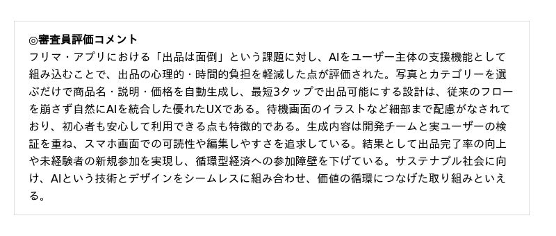 株式会社メルカリ(以下、メルカリ)は、「AI出品サポート」「メルカリモバイル」が、公益財団法人日本デザイン振興会が主催する「2025年度グッドデザイン賞」の「システム・サービス」カテゴリーにおいてグッドデザイン賞を受賞したことをお知らせいたします。