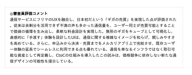 - 「フリマ」と「通信」のUXを融合し、日本初のギガ売買という新たな循環体験を創出- 無形の「ギガ」をキューブで可視化し、UIと連動したビジュアルコミュニケーションを設計- 申込みから支払い・ギガの売買まで、メルカリアプリ上で完結するシームレスな体験を実現