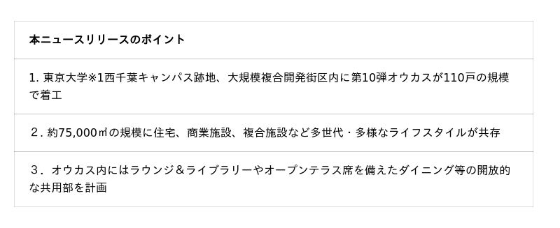 本計画は、東京大学西千葉キャンパス跡地約75,000平方メートル の本開発街区内に、110戸の規模で2027年4月の開業を予定しています。