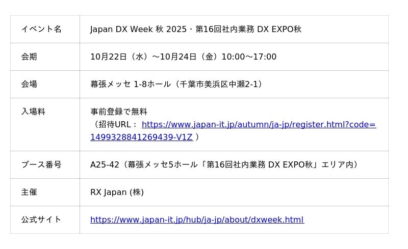 株式会社アイリッジ(本社:東京都港区、代表取締役社長:小田 健太郎、東京証券取引所グロース:3917、以下「アイリッジ」)は、2025年10月22日から10月24日の3日間、幕張メッセで開催される「Japan DX Week 秋 2025・第16回社内業務 DX EXPO秋」に出展することをお知らせします。