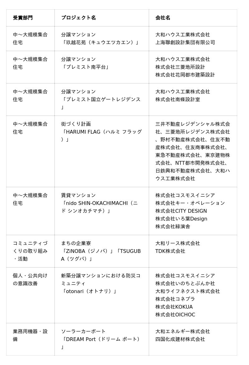 大和ハウスグループは、公益財団法人日本デザイン振興会が主催する「2025年度グッドデザイン賞」において、「中~大規模集合住宅」、「コミュニティづくりの取り組み・活動」、「個人・公共向けの意識改革」、「業務用機器・設備」の4部門で、8プロジェクトが受賞しましたので、お知らせします。