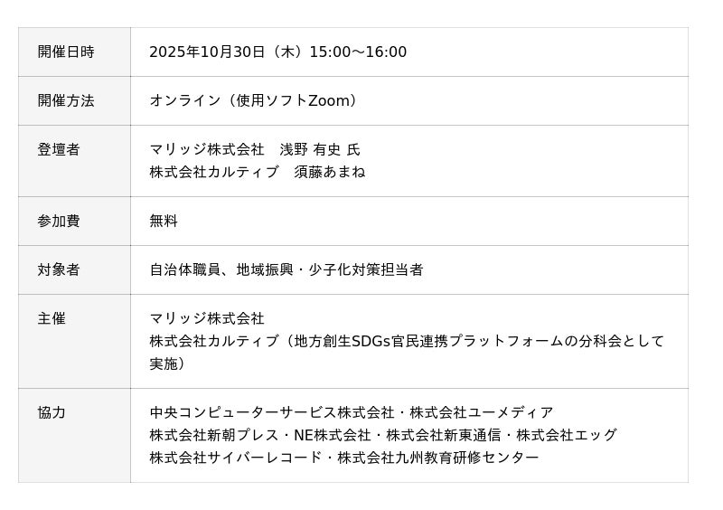 このたび、企業版ふるさと納税を活用した地域課題解決プラットフォーム「river(リバー)」を運営する株式会社カルティブ(本社:神奈川県横浜市、代表取締役:池田 清)は、「地域課題解決シリーズセミナー」のとして2025年10月30日(木)15:00~16:00に、自治体担当者を対象としたオンラインセミナー「自治体向け結婚支援~一年成婚サポート事業について~」を開催します。