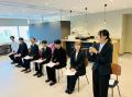 式典には、営業・生産・開発・デザインの各部門に配属予定の内定者7名が参加しました。営業本部、生産本部、開発本部の代表者から祝辞が述べられた後、社長の橋本より一人ひとりに内定証書が授与され、「新卒採用は即戦力ではなく未来への期待を込めたもの。失敗を恐れず挑戦してほしい」とのメッセージが贈られました。
