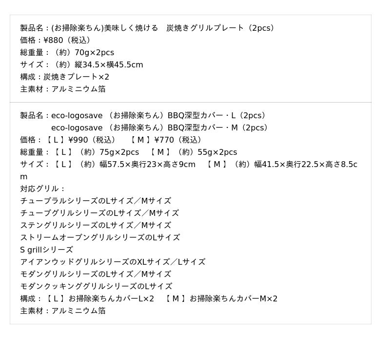 今回ピックアップする「 (お掃除楽ちん)美味しく焼ける 炭焼きグリルプレート(2pcs)」&「eco-logosave (お掃除楽ちん)BBQ深型カバー(2pcs)」は、どちらも”お掃除楽ちん”シリーズに属する、BBQ後のお掃除が簡単になるグリル用アクセサリーで、BBQグリルで美味しく炭焼きを楽しむためのプレートと、面倒なBBQグリルのお掃除を楽にするための火床用カバーです。