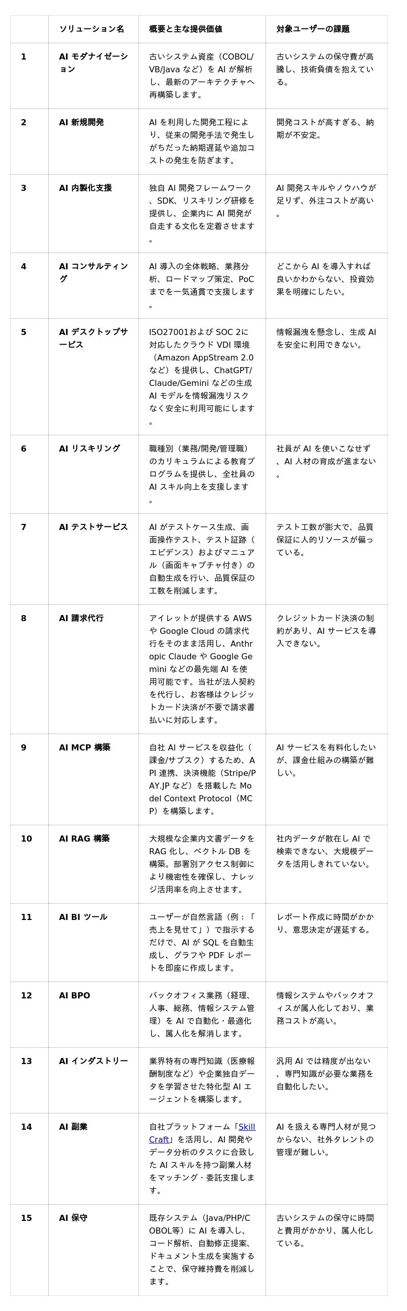 こうした背景を受け、この度アイレットは AI 活用による新規事業の機会創出という持続的競争優位性の獲得を支援するため、当社の持つ技術とノウハウを統合した AI 統合ソリューション群を開発し、創立22周年という記念すべき2025年10月15日より提供開始する運びとなりました。本サービス群は、開発・運用・教育・保守を一気通貫でサポートし 、企業の喫緊の課題を解決へ導きます。