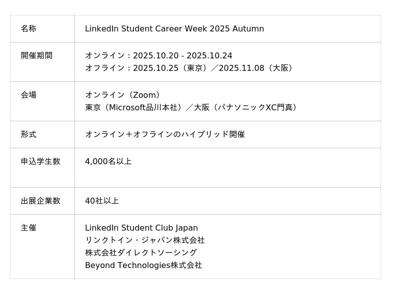 LinkedIn Student Career Week とは、学生団体LinkedIn Student Club Japan、リンクトイン・ジャパン株式会社、採用支援を行う株式会社ダイレクトソーシング、そしてBeyond Technologies株式会社の共催による、「グローバルキャリアを目指す学生」を対象とした、学生の学生による学生のためのキャリアイベントです。