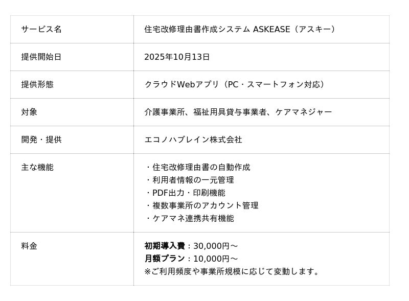 大阪市のエコノハブレイン株式会社(代表者:代表取締役 上田 司)は、ケアマネジャーの皆様の声を反映し、「一度使ってみたらわかる、その便利さ」を追求した住宅改修理由書作成・管理ツール「ASKEASE(アスキー)」を、2025年10月13日(月)より提供開始しました。