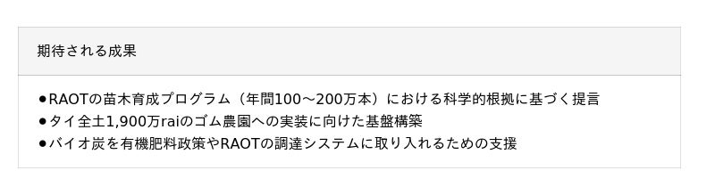 本実験で使用されるバイオ炭は、タイ国内で年間150万トン以上発生するゴム木廃材から製造されており、分析の結果、ゴム木由来バイオ炭は有機炭素含有率75%超、pHが高く、多孔質構造を持つことが確認されています。これらの特性は一般的な土壌よりも優れており、炭素貯留能力や土壌改良効果に大きな可能性を示しています。